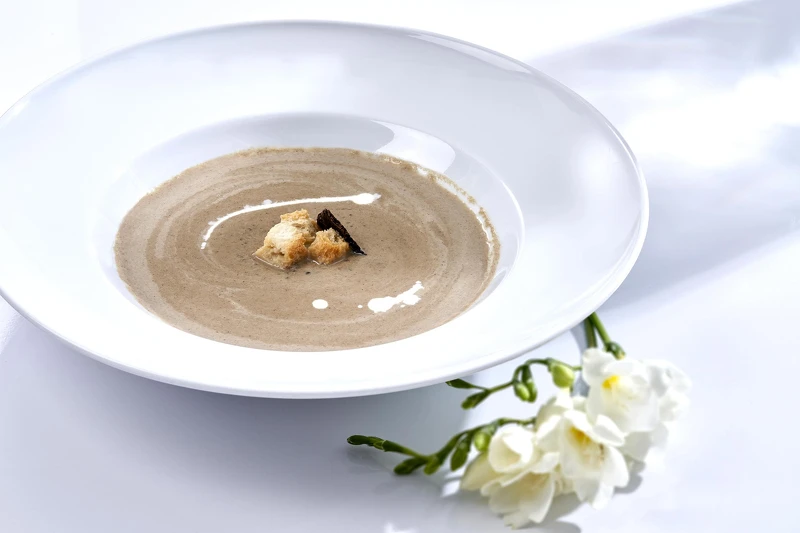 兩道清爽的前菜之後,呈上濃郁的黑松露野菇濃湯,主廚細心熬煮後鋪上極品黑松露,口感滑順而香氣十足。