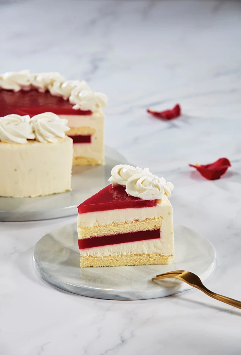 將荔枝果肉浸泡至玫瑰水中更增添香氣,再揉合法國伊斯尼鮮奶油打造出細致慕斯,夾入手工熬煮覆盆子、蔓越莓、黑醋栗成的莓果醬,入口感受微酸微甜的幸福滋味!