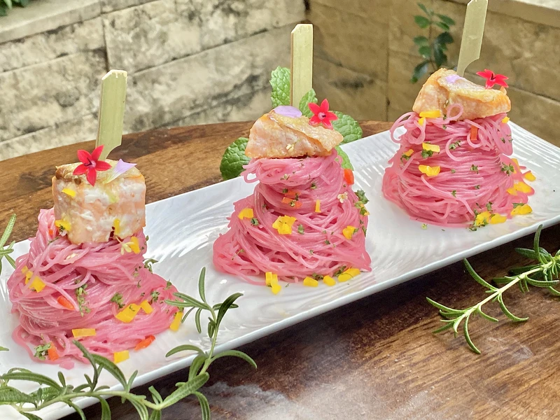 1、鮭魚排切一口大小後用鹽調味,取鍋乾煎上色,淋上法式香蒜醬汁備用;蒜切碎、紅黃椒切碎備用;將甜菜根切塊加水倒入果汁機打成汁過濾,再鮮奶油拌勻呈粉色備用。