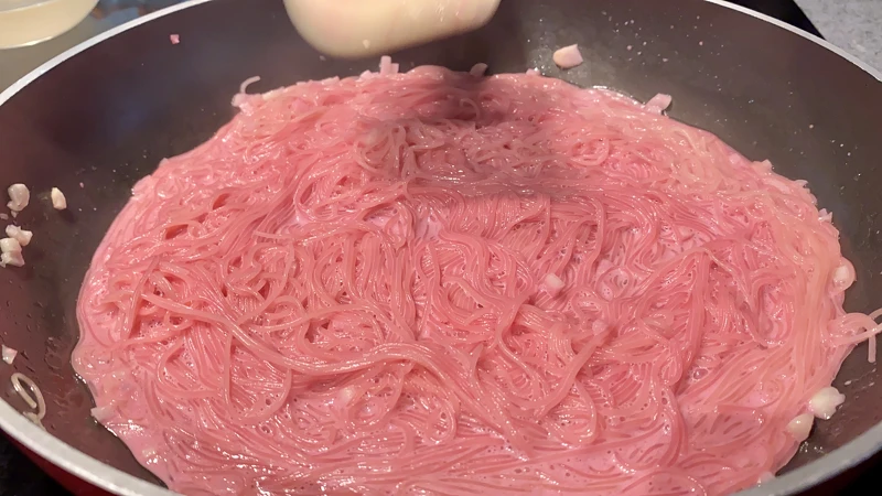 2、取鍋倒油,加入蒜碎爆香,再淋上雞高湯,加入川燙好的義大利麵、調好的甜菜根鮮奶油拌勻,待小火縮汁後熄火。