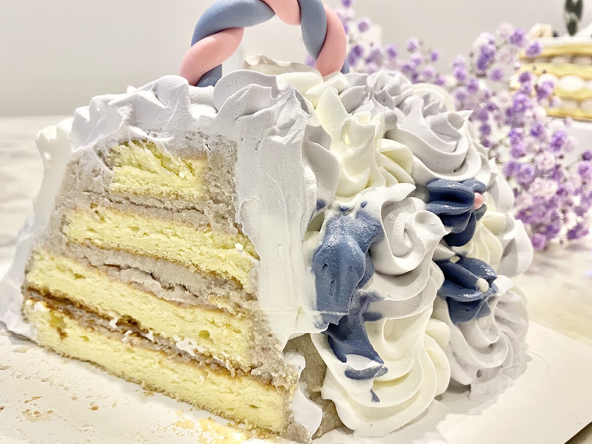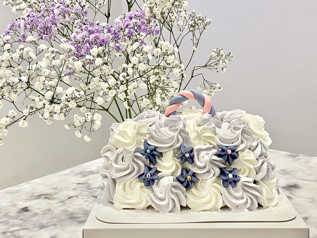 給媽媽一款獨一無二的限量包包,以戚風蛋糕為主體,夾層鋪滿大甲在地契作芋頭所製作的綿密芋泥,以及口感滑順的香草布丁,外觀擠上白、紫色交錯的玫瑰花,再使用時下流行的莫蘭迪色調鮮奶油花蕊來點綴,最後以珍珠糖裝飾!