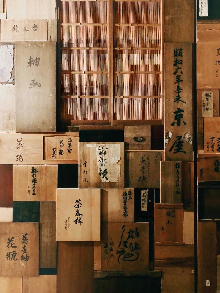 除了紙張,也再將舊時代的茶碗箱盒拆裝,仔細觀察能發現煙盒、茶碗盒已成為櫃檯的一部分。為了呈現真實老件原色,不僅箱盒不上漆,就連作為餐桌一環,鑲嵌入日本舊時販售兩 指鞋的“東京足袋“招牌,也同樣保持原狀,不做任何處理,為的就是不讓上漆後的反光影響木頭溫潤感。