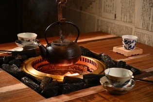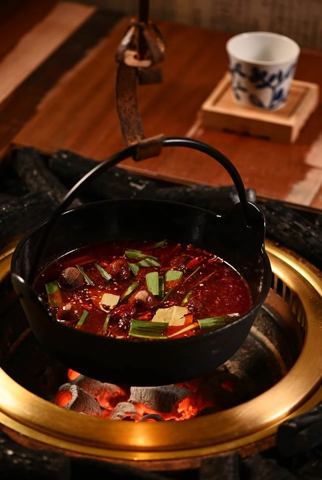 映入眼簾的是日本傳統古⺠家稱為「囲炉裏/INORI」的地爐,地爐設置主要由橫木與鐵棒來調節高低的「自在鉤/JIZAIKAGI」來吊起鍋子,在《胡同裏的寬巷子》內,這些配備不只是裝飾,更是全台首創藉以使用碳火烹調火鍋的器具。