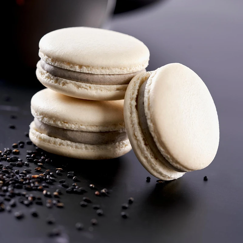 其中黑芝麻遵循傳統製法製成內餡,再巧妙加入核桃增添了堅果香氣及口感,一口咬下黑芝麻的香氣瞬間在口中擴散!還吃得到整顆核桃,整體濃郁風味與充滿多層次的口感馬卡龍。讓人忍不住一口接一口!