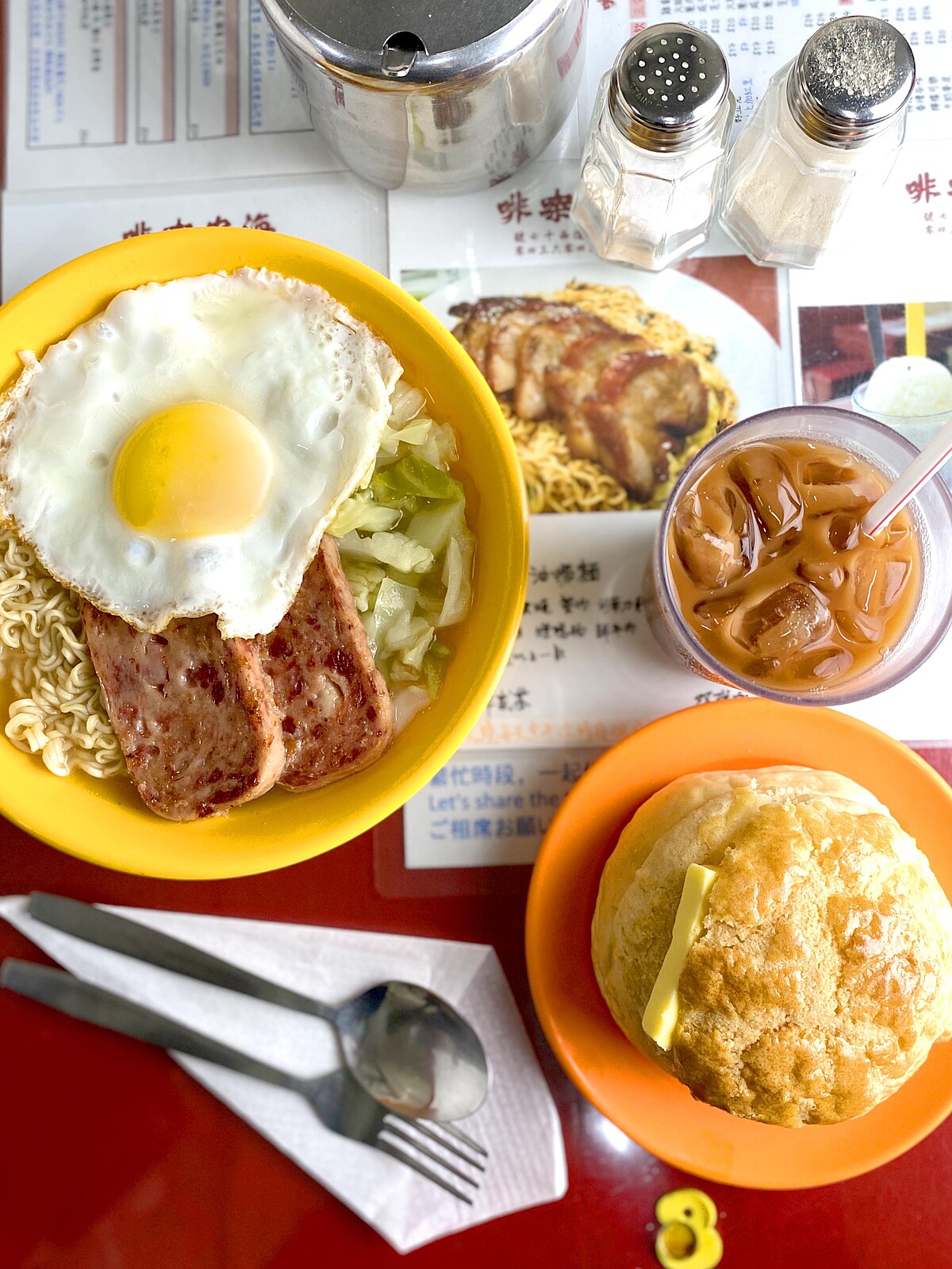 一整份餐點上桌,兩片餐肉、一顆荷包蛋,再加上公仔麵,就是最道地的香港早餐,公仔麵份量滿點,放眼望去在地人桌上都來上一碗,是開啟美好一天的必備美味。