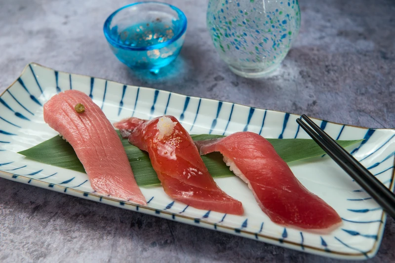 針對喜愛鮪魚的顧客設計的精選壽司,分別有油花豐富卻不膩口的日本進口黑鮪魚「極上大腹」,和以近海野生大目鮪或黃鰭鮪製成的「加味鮪魚」魚肉經特調醬汁輕漬、入口帶柚子清香,最後是取「鮪魚」中段製成的握壽司,油脂較少、口感清爽,三種風味一次滿足。