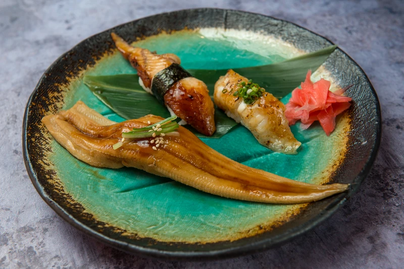 炙燒比目魚鰭邊、鰻魚、星鰻針對不敢生食的消費者而設計的組合,比目魚鰭邊肉炙燒後散發迷人脂香,入口即化。星鰻和白鰻口感細嫩軟滑,也很受歡迎。
