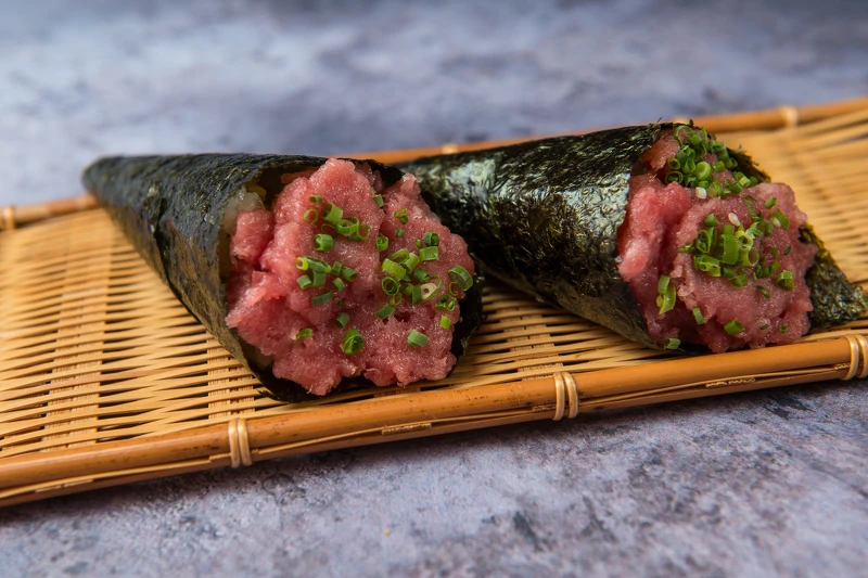 只挑嫩芽製作的有明海苔(苔中極品-福岡有明海苔)搭配,包入油脂豐富的黑鮪魚肚碎肉和壽司飯,趁海苔酥脆時大口咬下,感受舌尖上的奢華滋味。