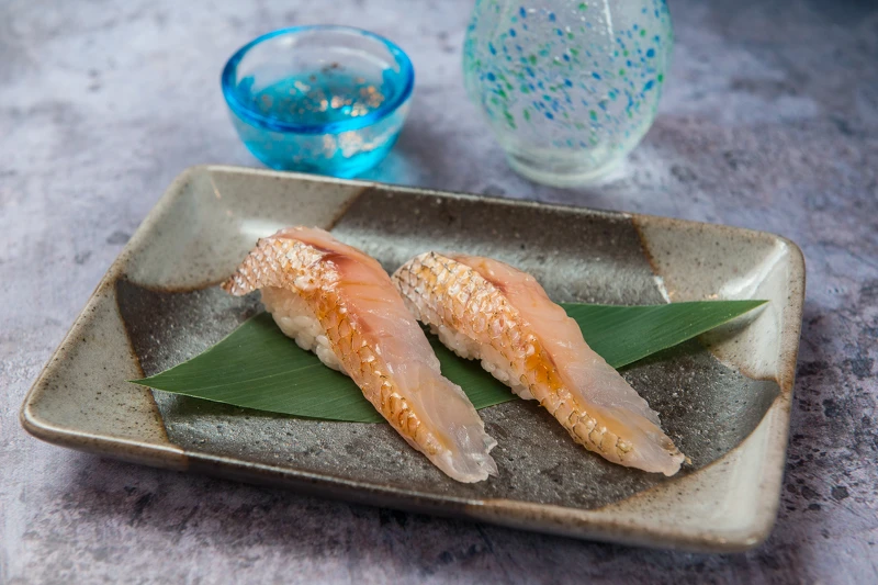 挑選來自屏東東港現流的手釣紅喉魚,油質豐富、口感紮實富彈性,佐真空包裝的現磨山葵泥與自家調製的壽司醬油入口,是老饕必點的極品。
