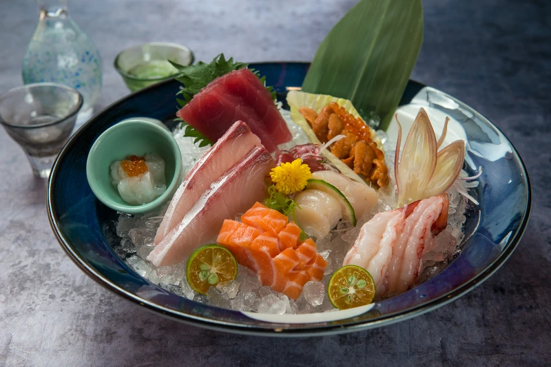 集合季節甜蝦、海膽蘿美卷、鮮干貝、鮪魚、鮭魚、白肉魚和透抽細麵等多道鮮美生魚,各具口感、滋味甘美,尤以澎湖透抽施以極細刀工切成的「細麵」軟糯香甜,令人印象深刻。