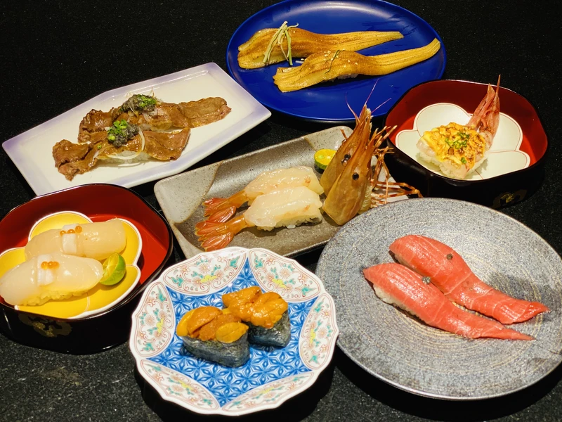 集合星鰻、鮮干貝、胭脂蝦、鮭魚卵、馬糞海膽、白肉魚、鮪魚和鮭魚等7貫人氣口味握壽司,一流的食材鮮度,加上手捏的壽司米飯,入口即化,是必點的入門款組合。