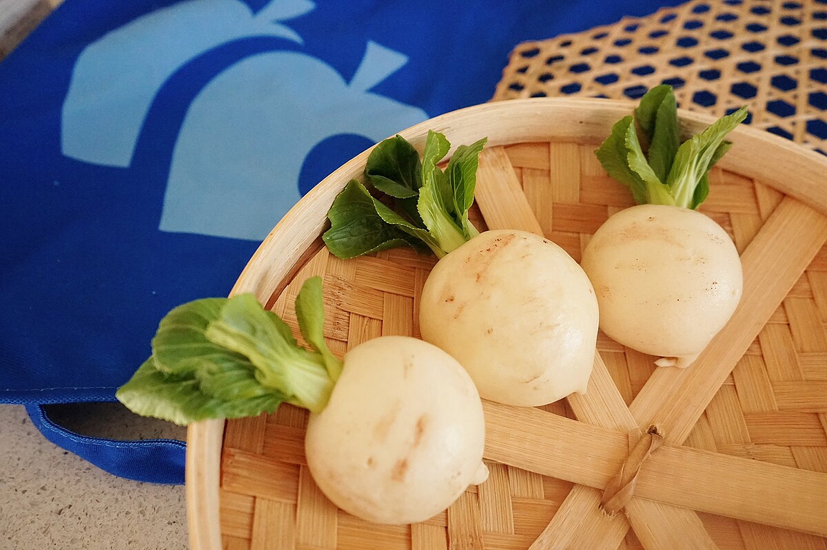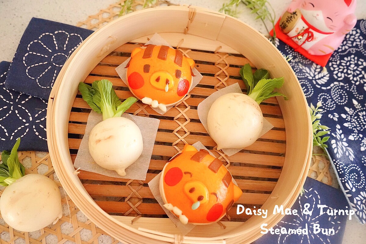 包子的內陷使用了豬絞肉、蘿蔔製作而成,大頭菜包子上方還用青菜裝飾100%還原大頭菜!
