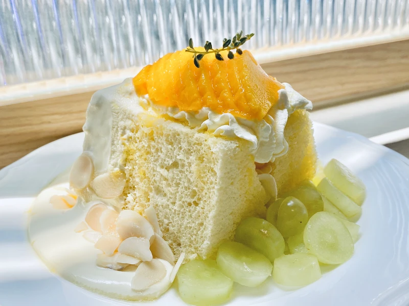 店內招牌手工香草戚風蛋糕,夾入新鮮芒果、柳橙檸檬奶油、再淋上主廚特調的柳橙芒果淋醬、杏仁片…等等。