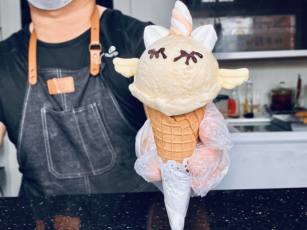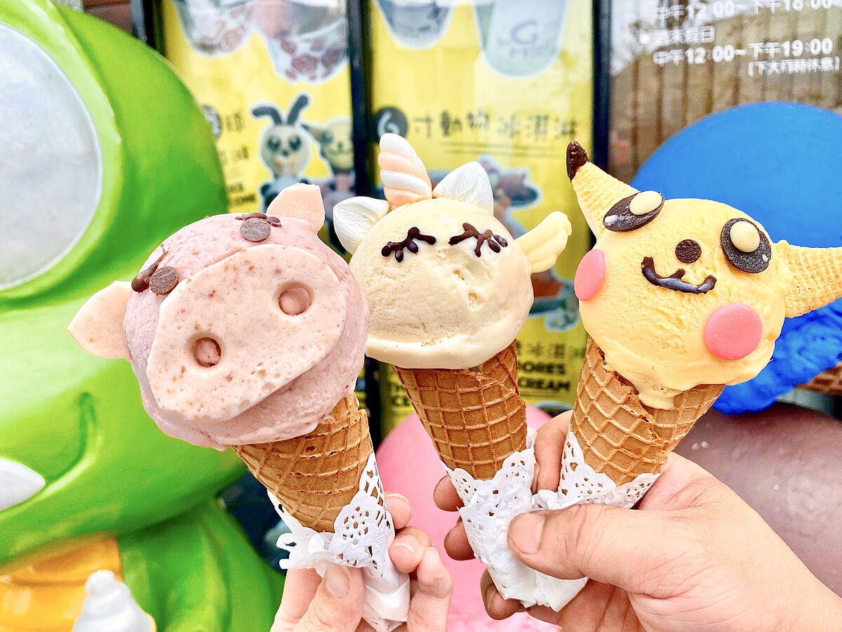 將冰淇淋製作成各種不同動物造型~像是粉嫩的豬豬造型,使用玫瑰花瓣製成的冰淇淋,眉毛使用巧克力醬繪製而成,入口感受玫瑰淡雅香氣,不會過於甜膩!