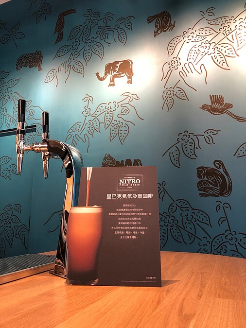 藝術牆面則在大片底色為天空藍綠色的牆面上,繪上以肯亞、蘇門答臘、瓜地馬拉咖啡三大產區的動物們,有如在天空寬廣自然的環境下自由地生活著,呼應新竹市立動物園打造對動物友善環境的寓意。