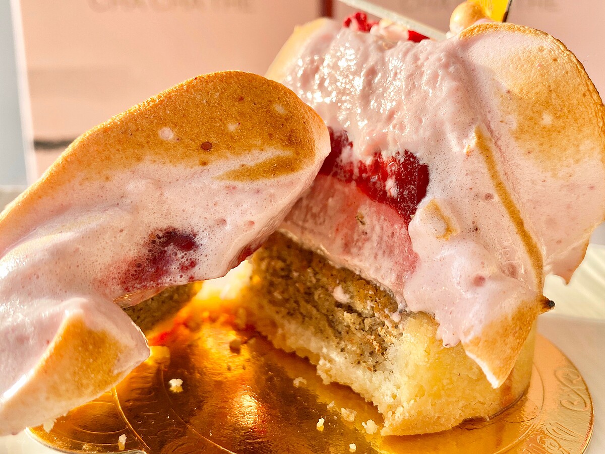 玫瑰花冠的造型以天然玫瑰水混入蛋白霜製成,切開花冠,見到的是覆盆子風味庫利、奶霜餡、東方美人茶抹醬與杏仁餡;入口先是玫瑰香氣,接續引領出水果調的東方美人茶香,搭配多層次的質地口感,是采采今夏力推的皇家滋味甜點!