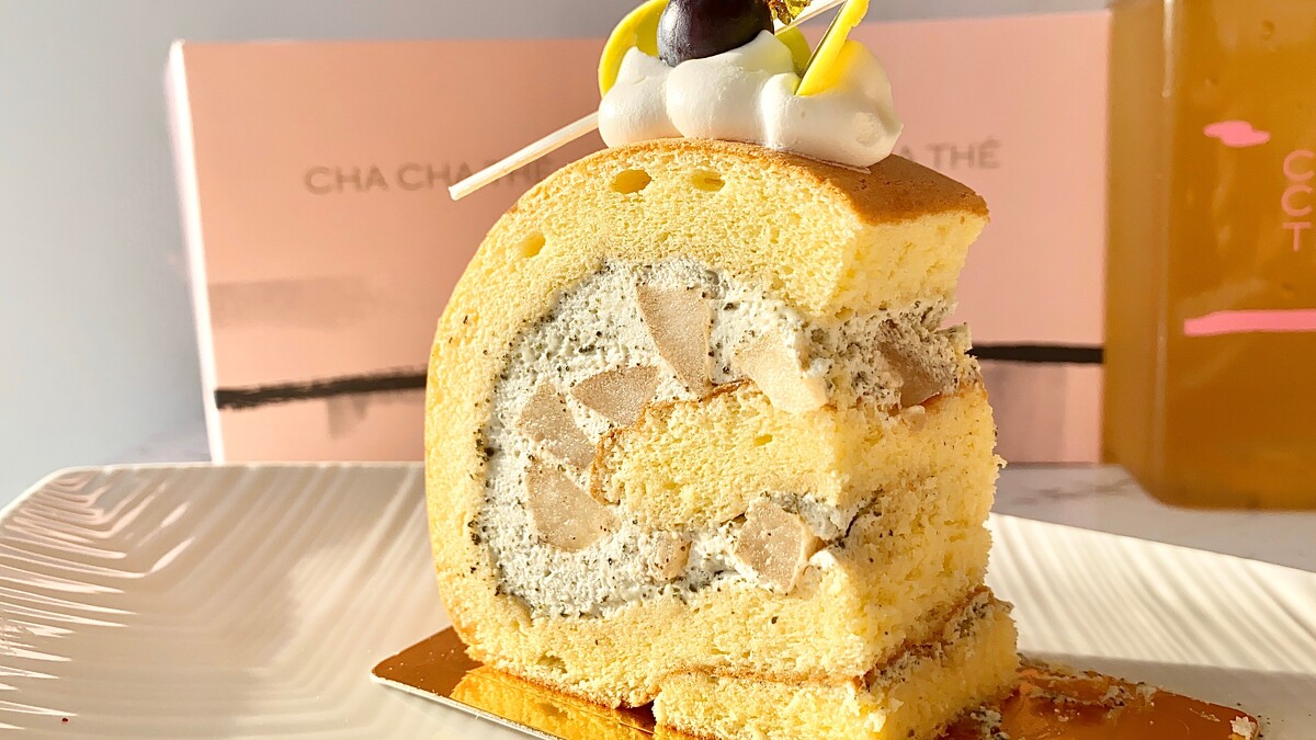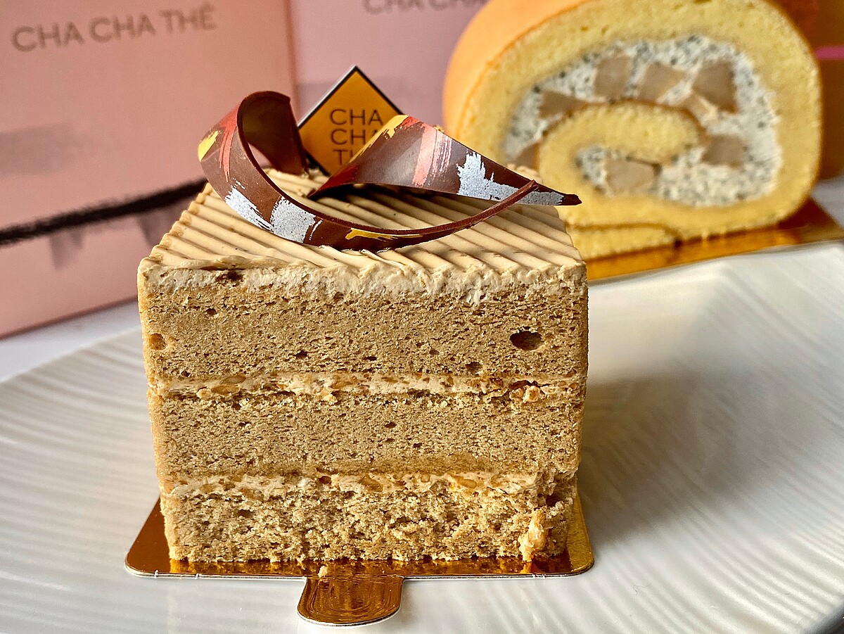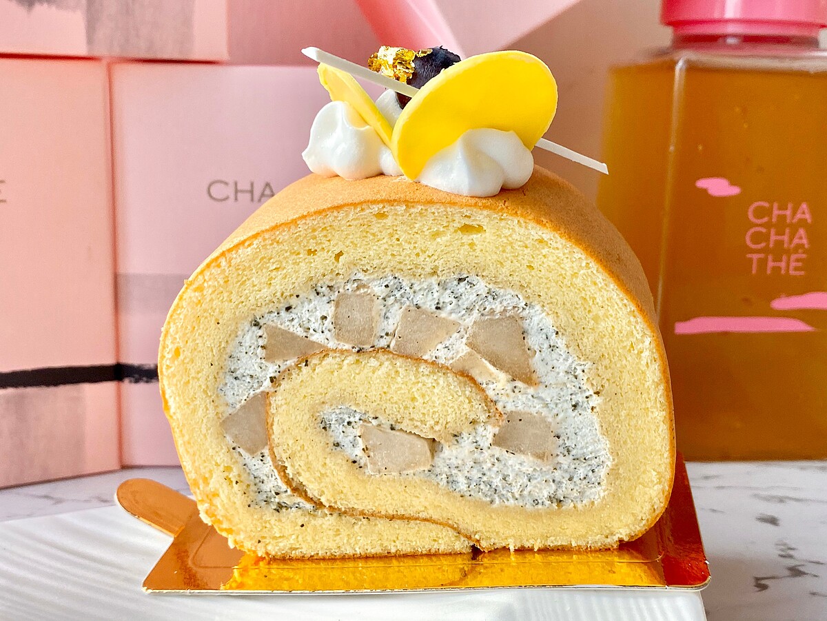 戚風蛋糕捲起梨山烏龍茶粉調製的鮮奶油餡,白酒蜜漬過的洋梨丁排列其中;梨山烏龍的淡雅香氣夾著香甜的西洋梨口感,質樸而清新爽口。