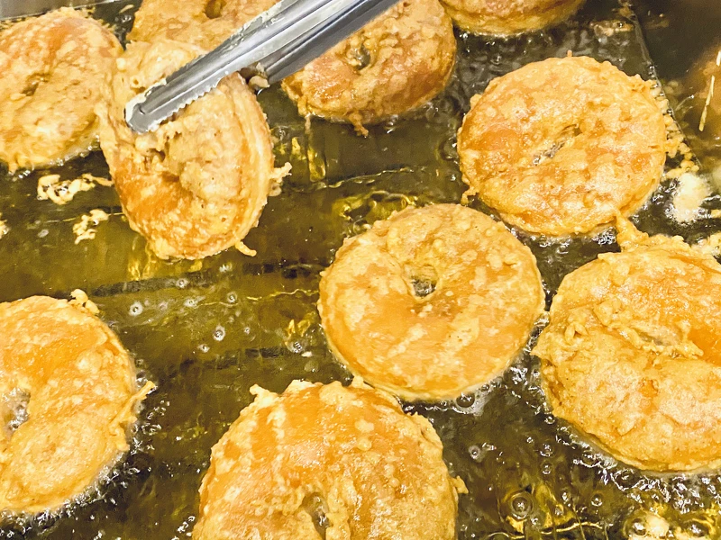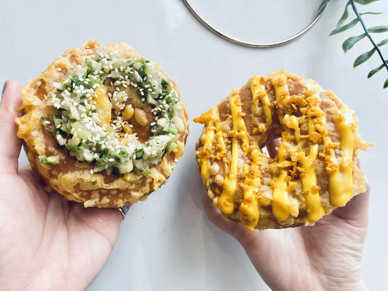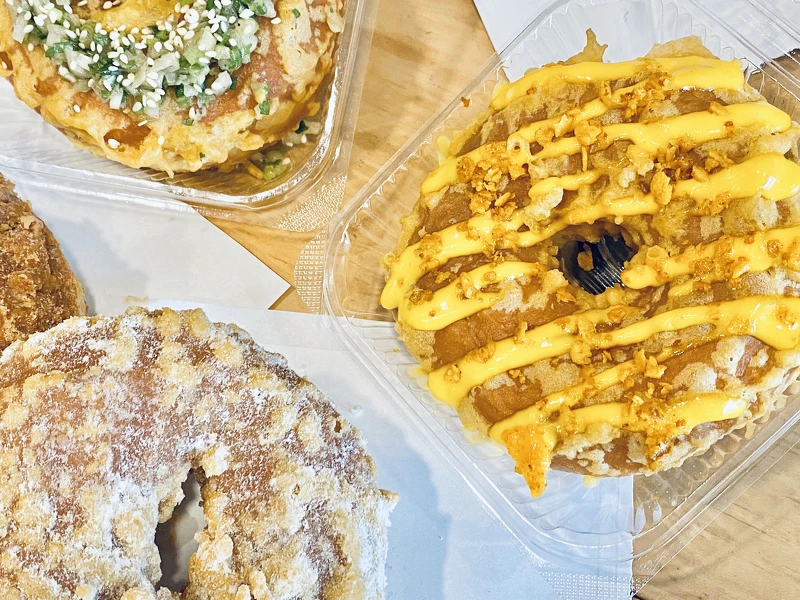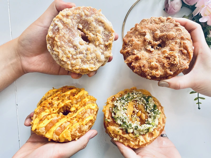 圈粉台式脆皮甜甜圈,有別於美式甜甜圈,品嚐起來外層酥脆、內層柔軟,依照台灣人口味研發出不會過於甜膩的口味,店面目前販售花生、原味鮮奶、金沙鹹蛋黃、青蔥椒鹽4種風味,鹹甜口味通通有!