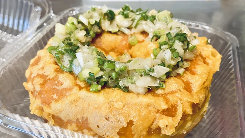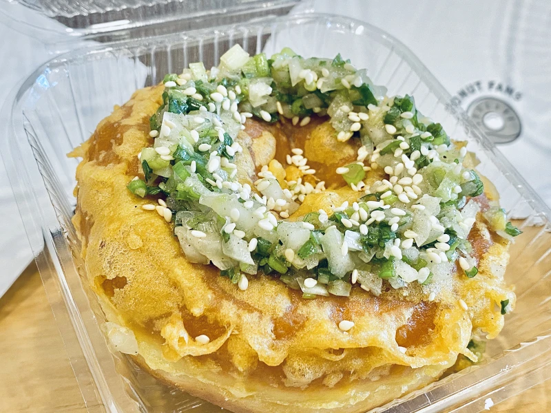 還有一款也是令人欲罷不能的季節限定商品!在脆皮甜甜圈搭配佈滿青蔥與椒鹽混合出的配料,入口感受像是燒臘店的油蔥滋味,頂部再用白芝麻做點綴,一口咬下鹹香滋味酥脆的甜甜圈完美結合,喜愛重口味的人必點!