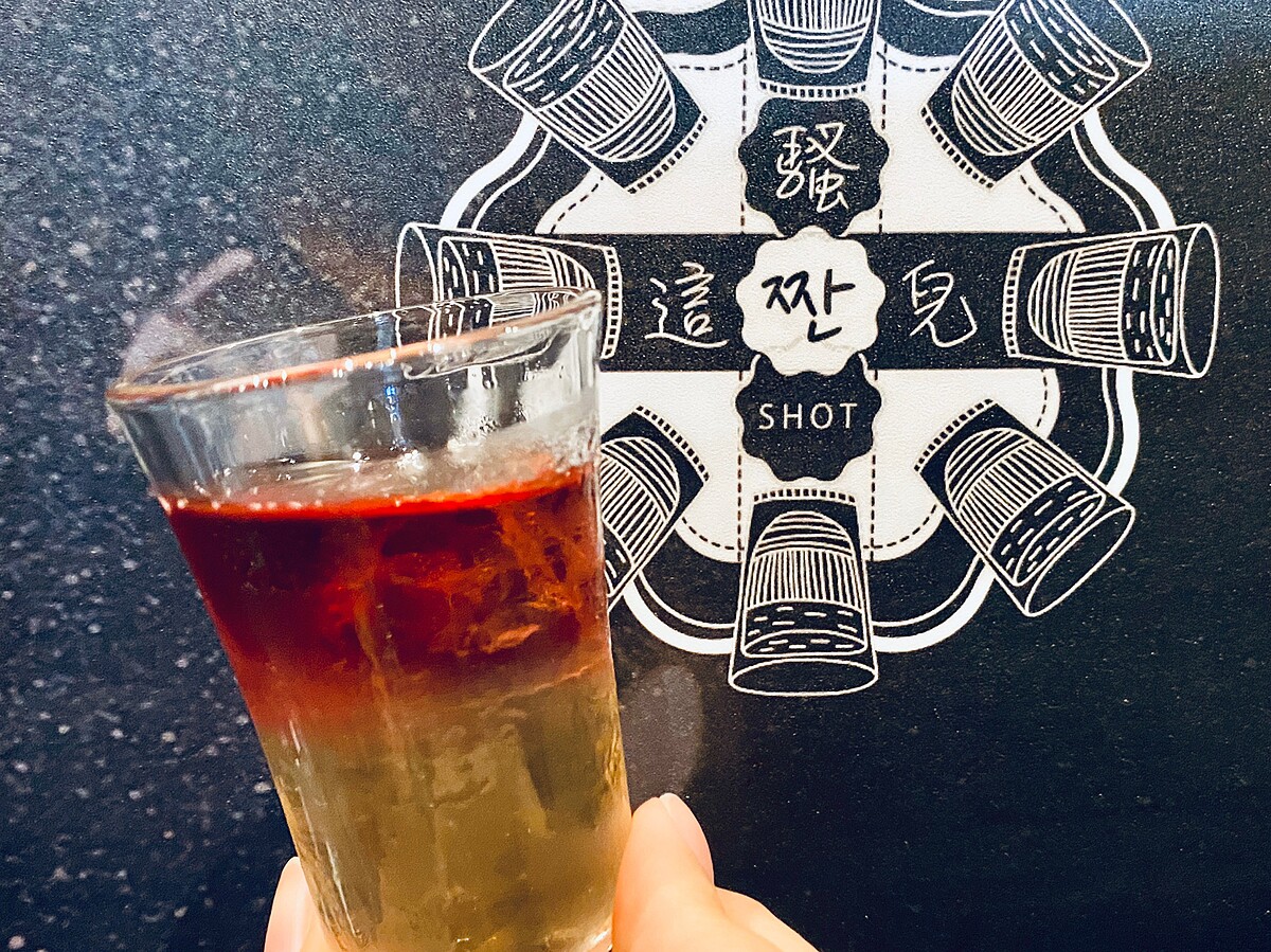 改編經典調酒New York Sour,將威士忌、紫蘇、佛手柑奶洗澄清後,漂浮上自製香料紅酒,一口燒肉一口Shot,清爽無負擔