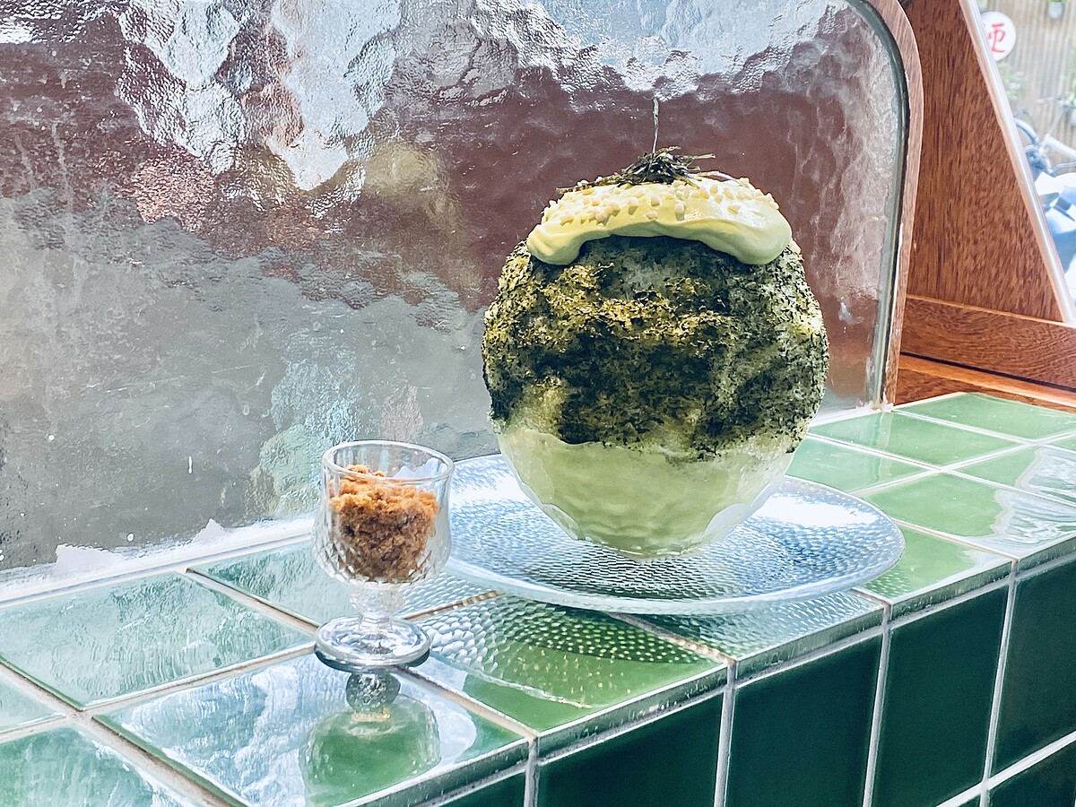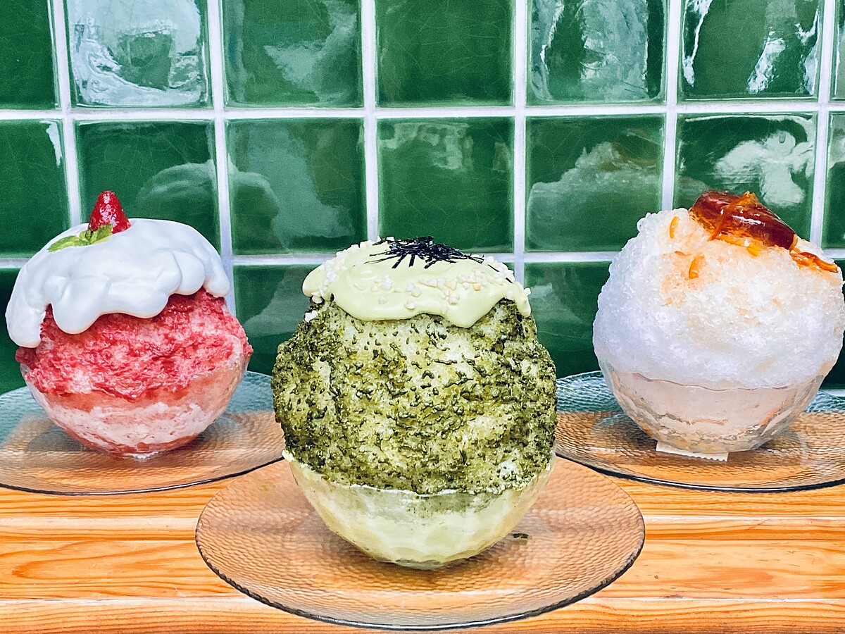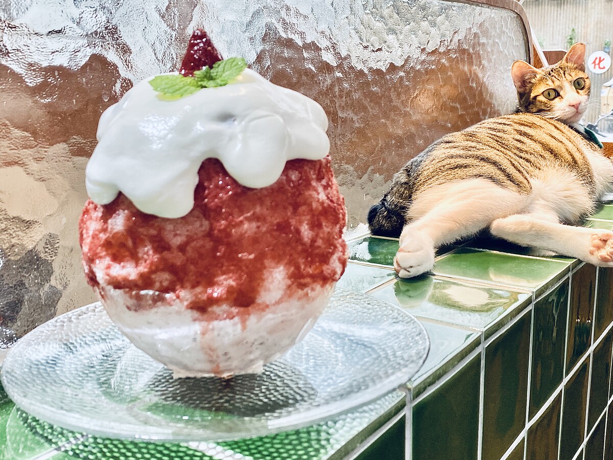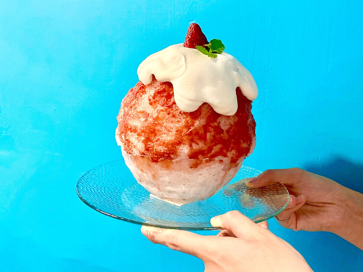 晴子冰室有別以往對於剉冰的印象,加入紅豆、綠豆……餡料,最有趣的是圓滾滾的刨冰中藏著令人意想不到的餡料!裡面居然放入了蜂蜜蛋糕,像甜點一樣的概念,最外層則淋上滿滿的手作草莓淋醬,擠上草莓鮮奶油放上糖漬草莓。