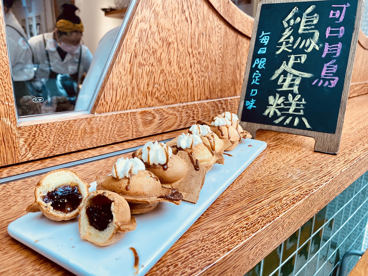店內不只有販售冰品還有可口月鳥雞蛋糕,會不定期推出不同口味,這次品嚐到的是黑糖瑪奇朵,加入整塊的黑糖麻糬,再擠上鮮奶油,淋上太妃糖醬,甜而不膩、口感豐富多層次,也適合搭配戀愛巴士一同享用!