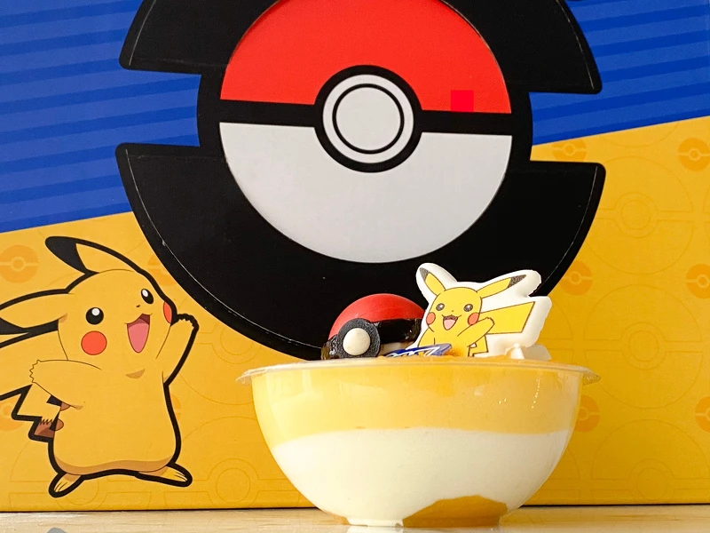 以皮卡丘為設計,可愛的模樣完全像是剛從動畫裡跑出來。以香草戚風蛋糕為基底,內餡夾心香草&芒果慕斯,搭配酸酸甜甜的檸檬優格奶霜與芒果柳橙醬,乳酸凍與芒果柳橙Q凍,酸酸甜甜夏天品嚐超療癒!