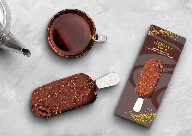 其中首推英式經典口味「GODIVA伯爵紅茶風味杏仁黑巧克力流心雪糕」,主廚將伯爵茶溫順醇厚的茶香,結合GODIVA比利時巧克力特有的香濃,外層杏仁碎及巧克力脆片加上黑巧克力冰淇淋包裹伯爵茶流心,多層次的濃郁香氣令人著迷。