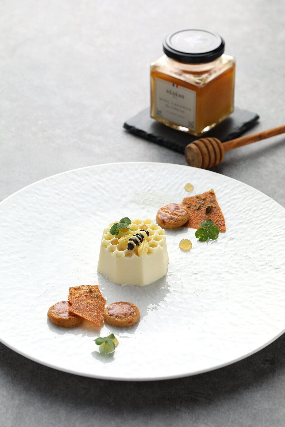 Parfait源自法語有"完美"的意思,有分為美式Parfait又稱百匯,法式Parfait則是一種在打發蛋白中加入糖和奶油,然後將其冷凍,是最傳統的Parfait,口味上近似於冰淇淋。芭菲是一道經典法式甜點,是以冷凍的方式呈現,主廚特選桂花釀加入其中,更再桌邊現淋薰衣草花蜜提升甜點層次,兩側搭配上自製的布列塔尼酥餅與開心果脆片。因甜點有加入打發蛋白,是一道極具空氣感的甜點,建議盡速享用以免融化。