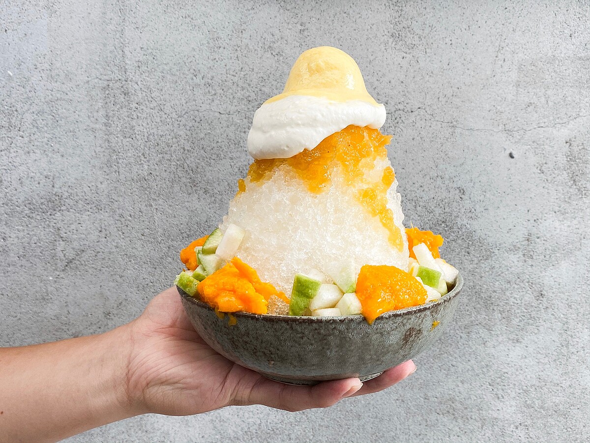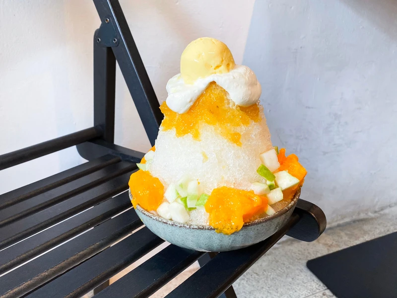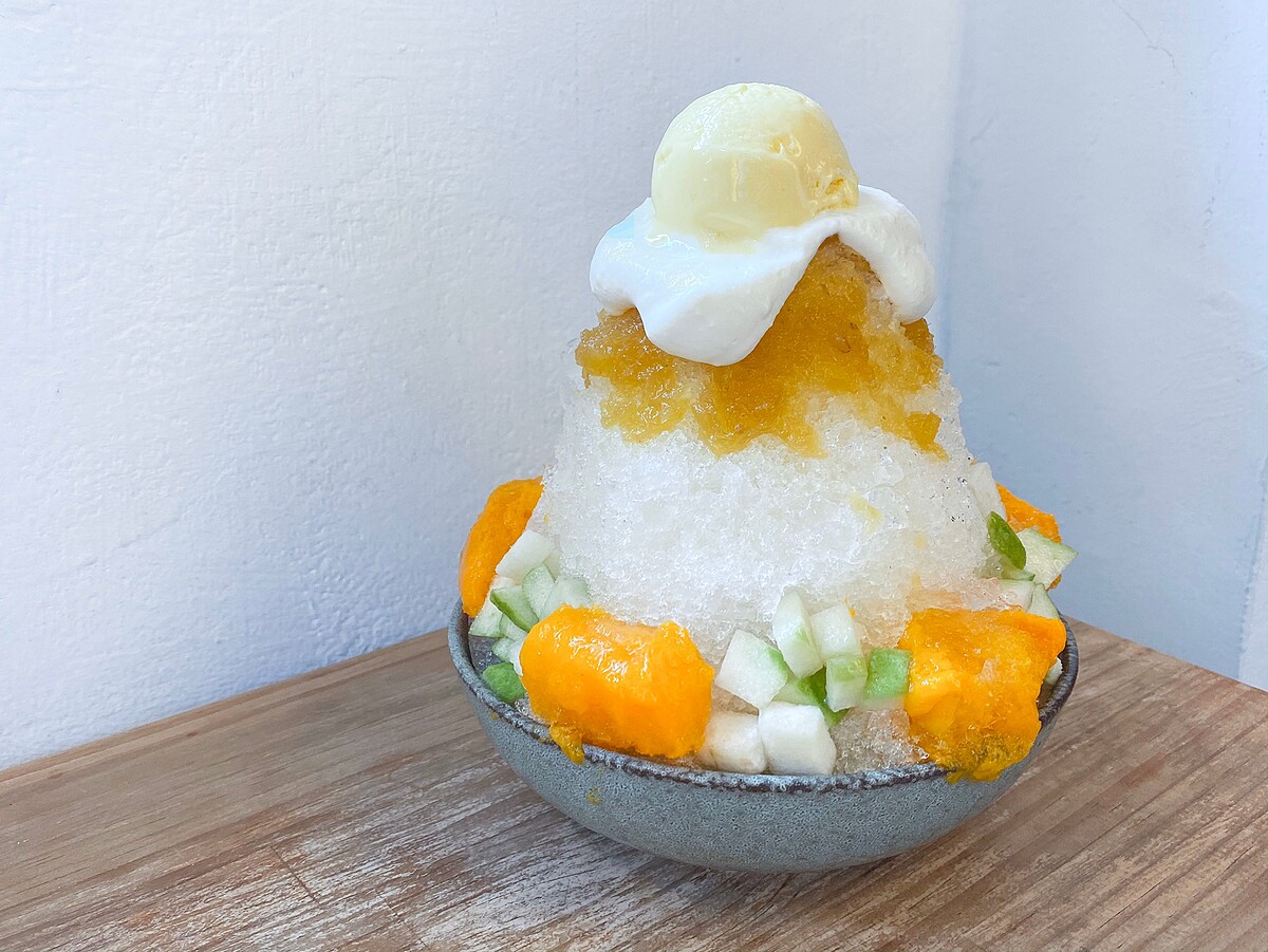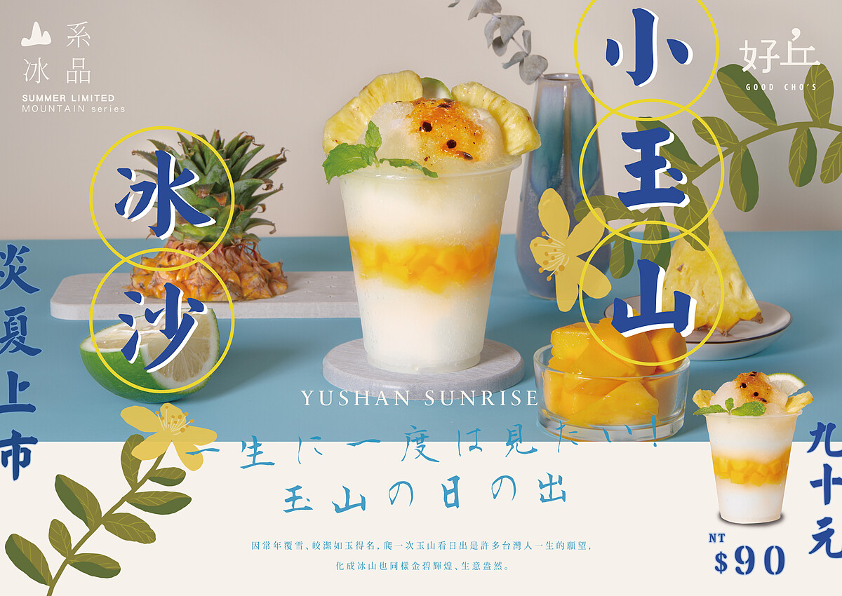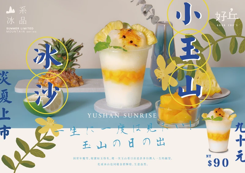玉山是台灣第一高峰,更是東亞最高峰,因常年覆雪、皎潔如玉得名,因此選用台灣最負盛名的夏季水果,新鮮香甜的愛文芒果與芭樂丁為配料鋪滿山腰,另又藏有散發甜味的香草冰釀鳳梨。並淋上以鳳梨果醬和薄荷特製的水果淋醬,最後於山頂上覆蓋著海鹽鮮奶油與芒果牛乳冰淇淋,品嚐融合多種在地水果風味,清爽又消暑的夏日滋味。