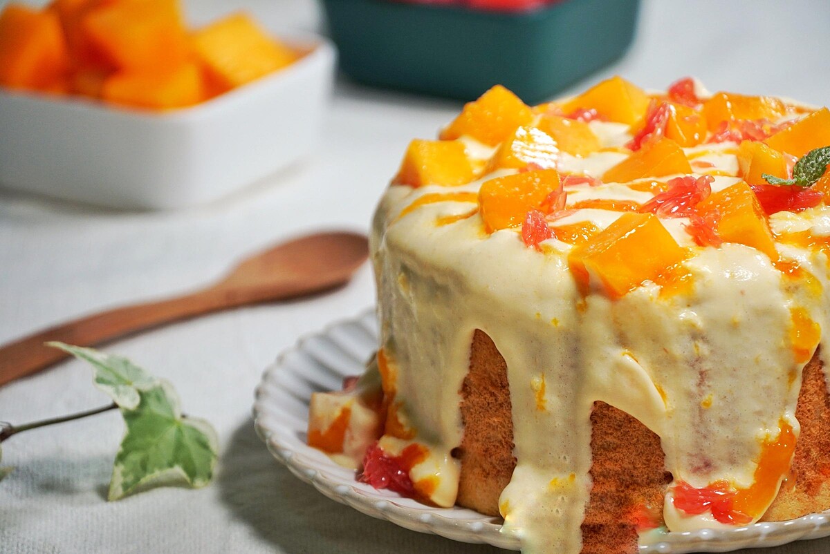 最後再將芒果柚子果醬、愛文芒果及葡萄柚塊隨意地擺放,大家收到蛋糕後,如果立即拉開蛋糕圍邊紙,奶蓋將會緩緩流下,超級療癒人心。