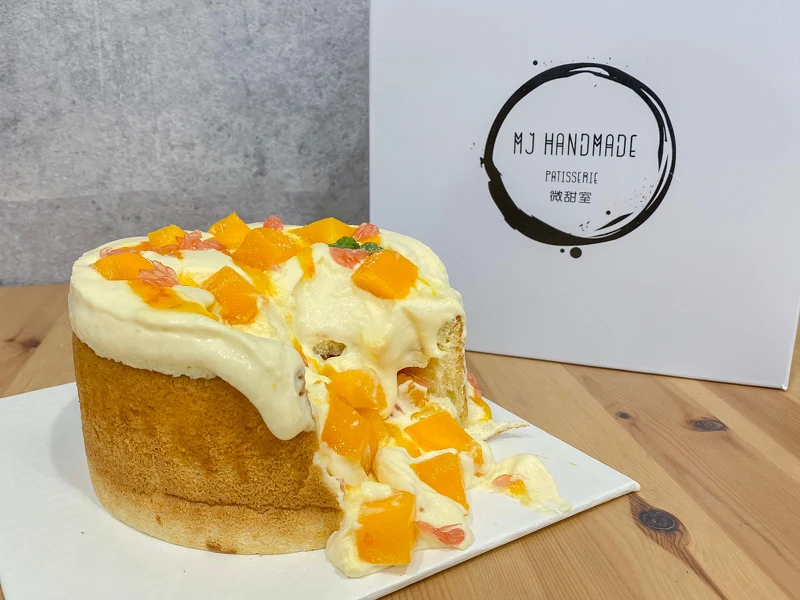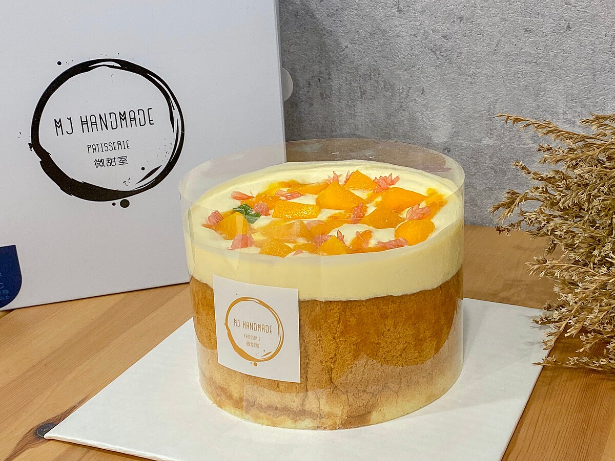 「楊枝甘露」深受饕客喜愛,因此許多品牌紛紛推出飲料、甜品及冰棒,而微甜室更發揮創意改造成蛋糕,再搭配台灣芒果香甜風味更佳,基底以牛奶風味戚風蛋糕作為主體,淋上椰汁及自製芒果柚子醬製成的鵝黃色奶蓋,誘人的色澤令人食慾大開!