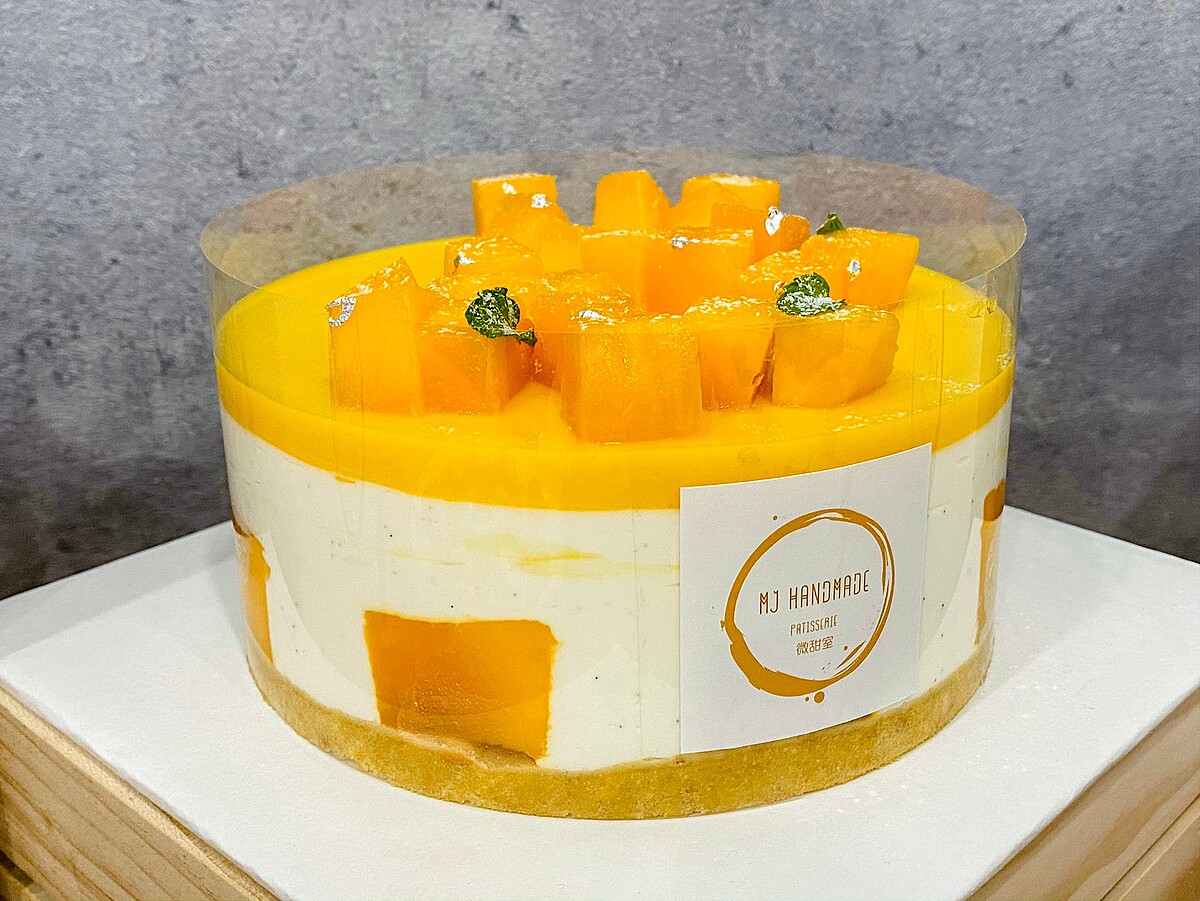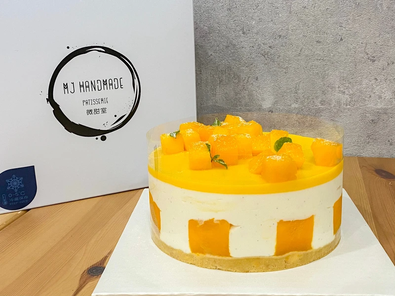 淋面則使用不加一粒糖的新鮮芒果奶凍,新鮮天然香甜味搭配「希臘優格奶霜」兩者皆入口即化,最後上方裝飾一口大小的切塊芒果及銀箔點綴,吃下立即降低夏季炎熱帶來的「茫茫感」彷彿重獲新生!