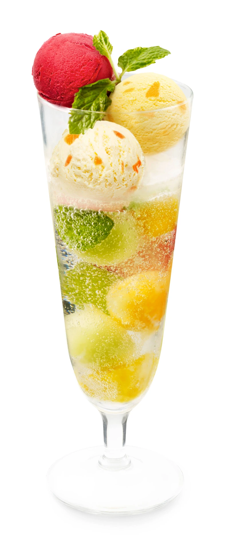 新口味哈蜜瓜、芒果以及覆盆子冰淇淋與白酒、伏特加完美調配,搭配繽紛多彩的新鮮水果漂浮在酒杯,絕美夢幻調酒傳遞香甜果感,輕鬆享受的夏日微醺。