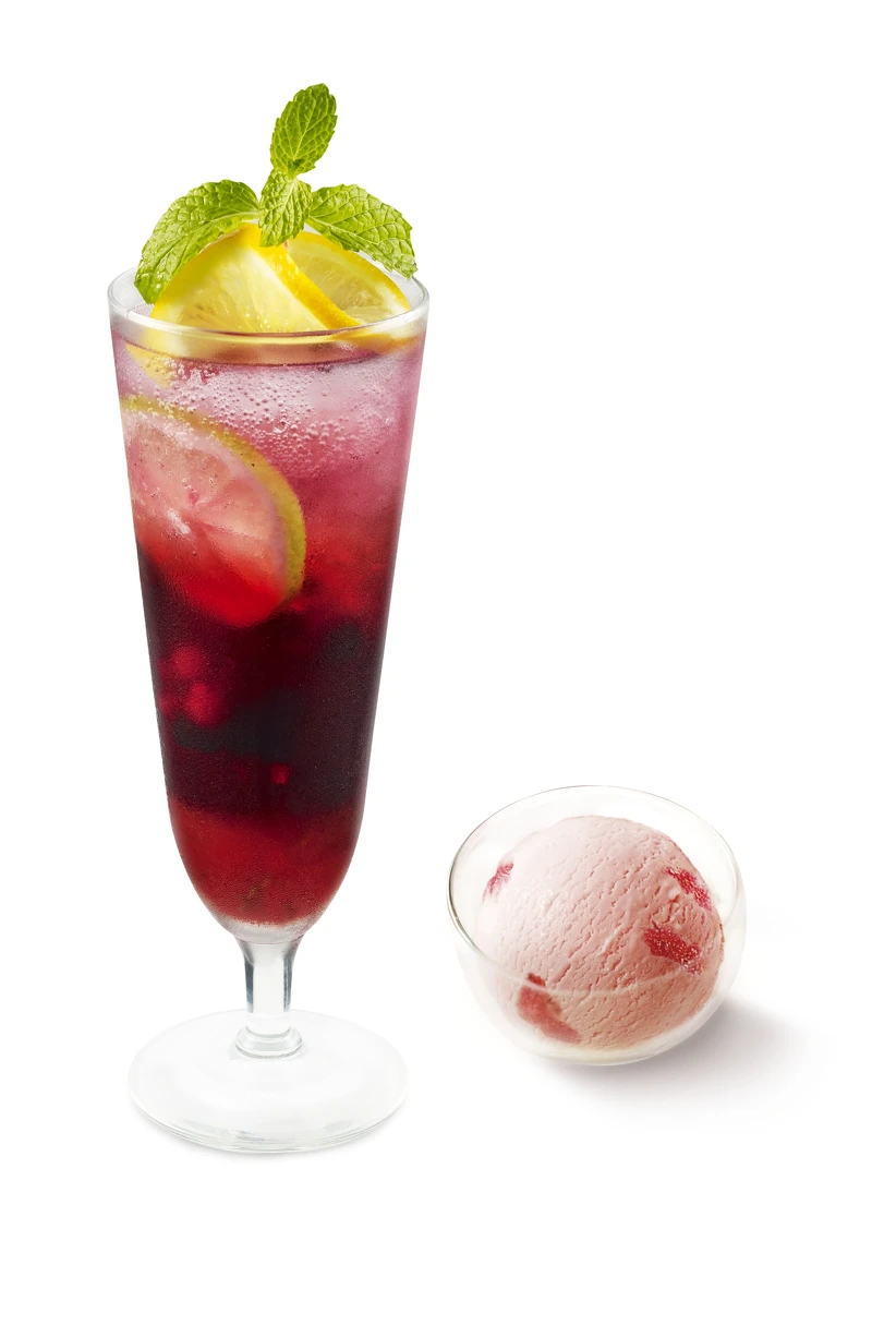 哈密瓜與草莓浸泡氣泡水中,搭配哈密瓜、芒果冰淇淋及覆盆子雪酪,享用部分冰淇淋,再將冰淇淋與氣泡水攪拌均勻,霎那間,成為一杯香濃不膩的果昔。時尚繽紛的色彩,加上滿滿天然果香,與夏天談戀愛了。
