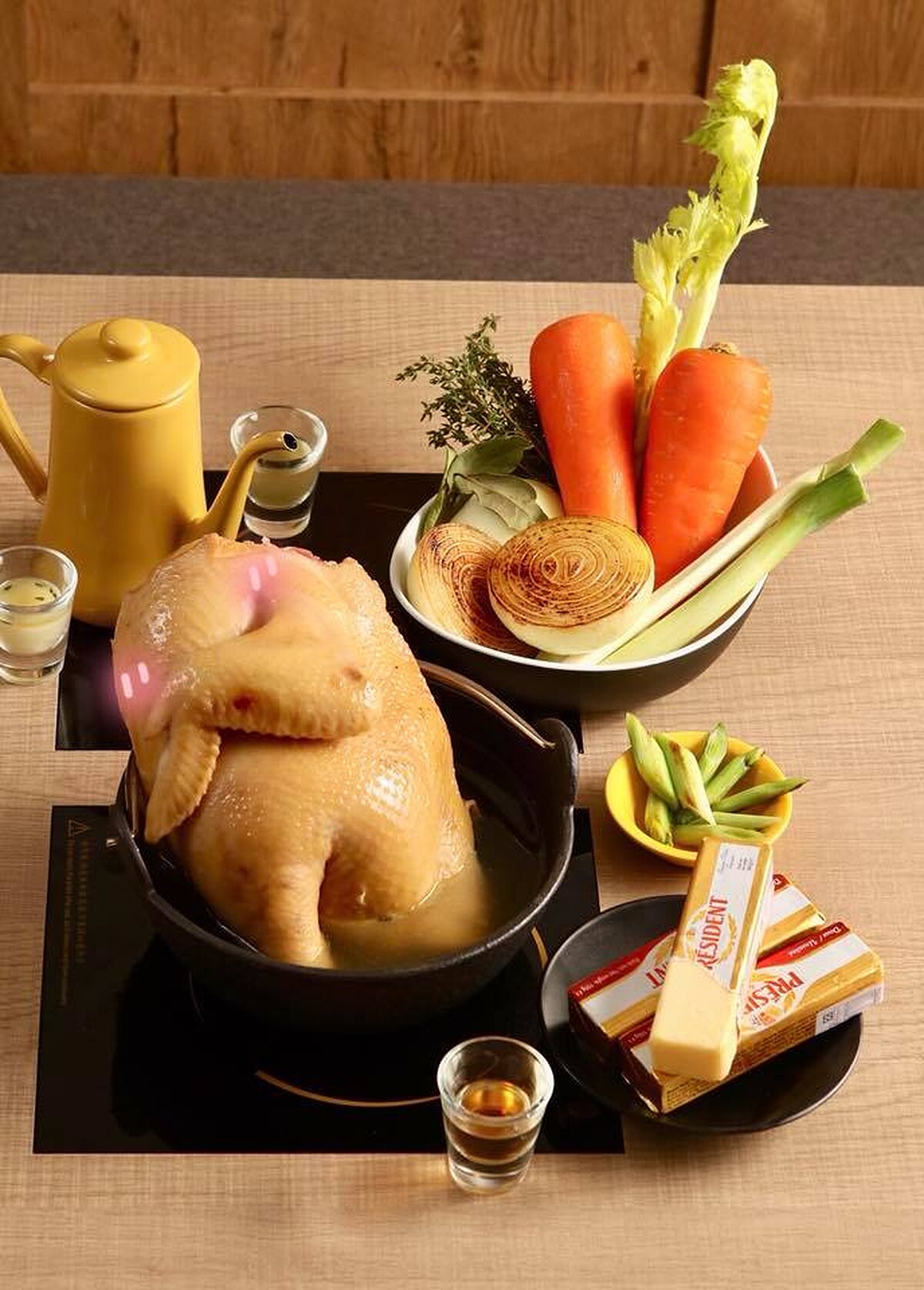 經典雞湯上桌沸騰後,淋上香醇白蘭地、百里香等法式香料,趁熱啜飲溫潤又濃郁的厚實口感,加入食材吸飽精華,所有蔬食、肉片也瞬間升級了!