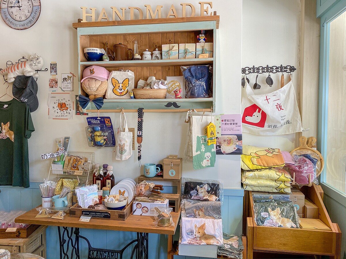 店面入口處還有一系列柯基的療癒小物從杯盤、環保提袋,有些商品是出自於老闆娘的巧手,親自縫上奶油先生的LOGO超可愛,真的是會想全部打包帶回家!