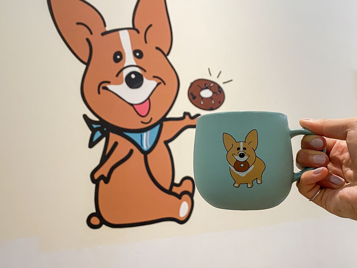 店面從裝潢到餐點處處充滿柯基的蹤影,無論是牆面插畫、公仔擺設讓人驚喜,店面許多柯基插畫、商品都是由老闆娘親自設計。