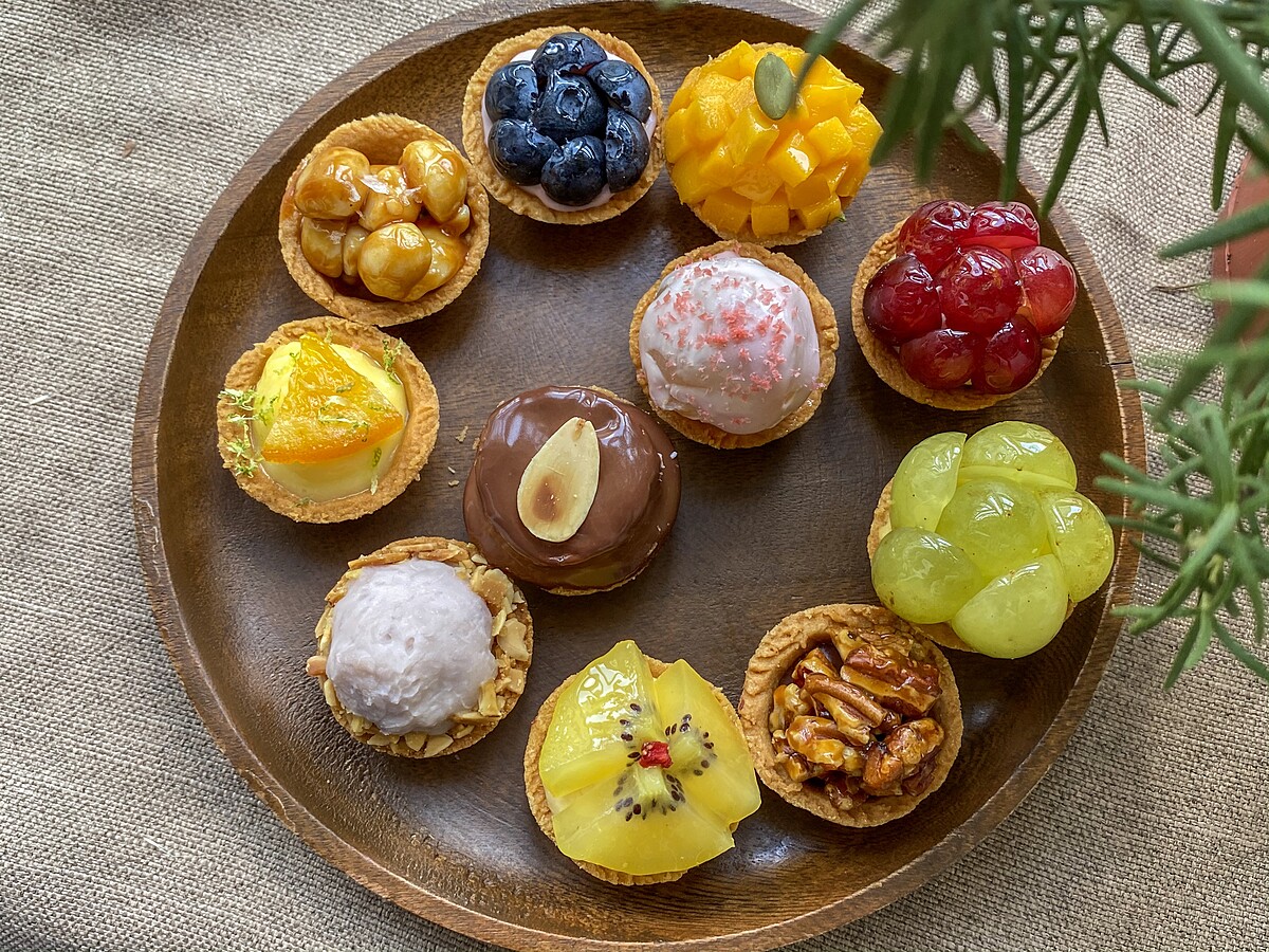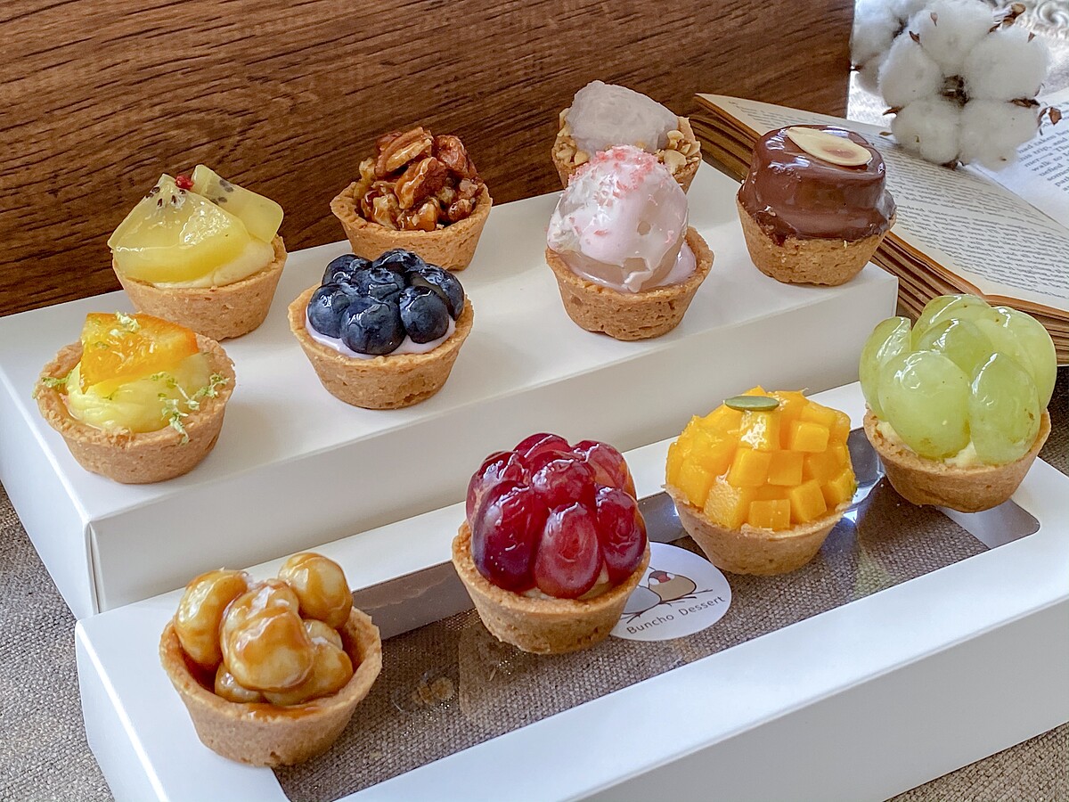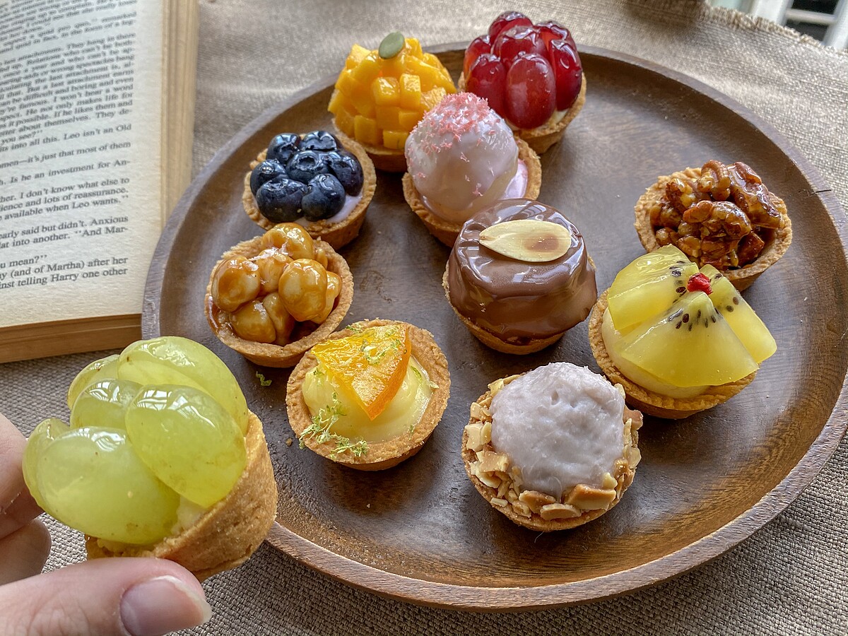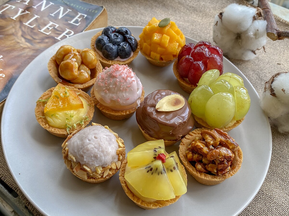 還有一系列不同的迷你塔可以選擇,像是藍莓生乳塔、帶有堅果香氣的胡桃巧克力塔、焦糖夏威夷豆塔、檸檬塔、黃金奇異果卡士達塔……等等。