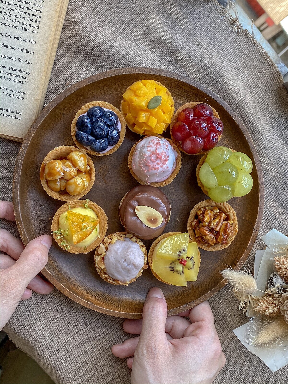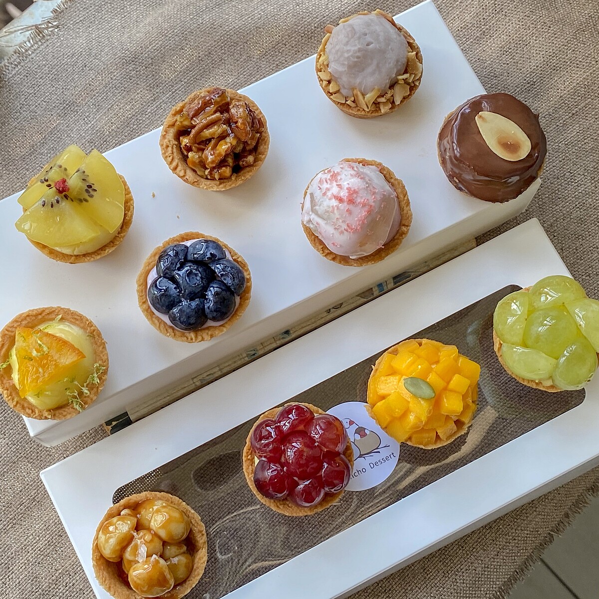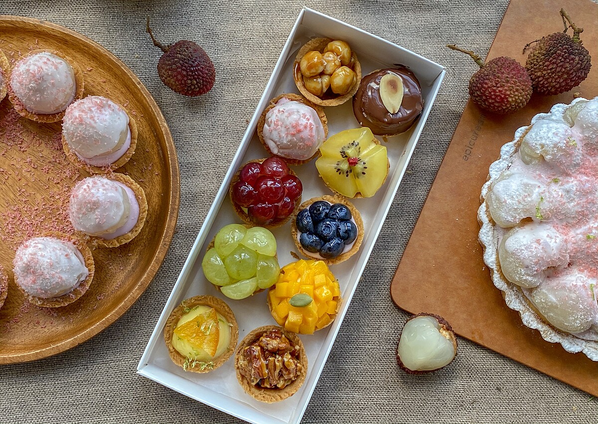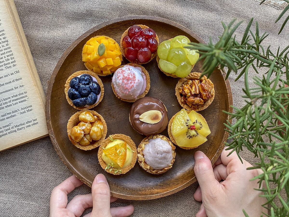 還有一系列不同的迷你塔可以選擇,像是藍莓生乳塔、帶有堅果香氣的胡桃巧克力塔、焦糖夏威夷豆塔、檸檬塔、黃金奇異果卡士達塔……等等。