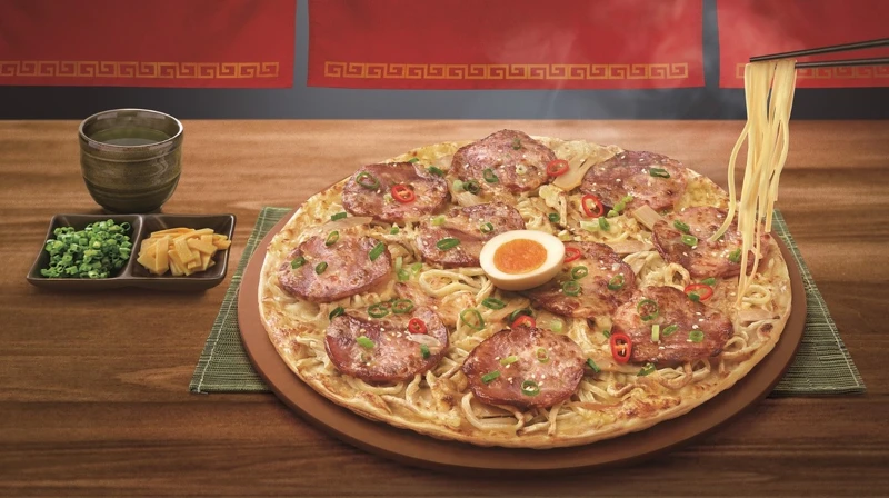 這款口味就連在日本都吃不到,餅皮上的拉麵麵條吸飽豚骨湯汁,披薩和拉麵的巧妙結合,肯定是本季最具話題的新商品。