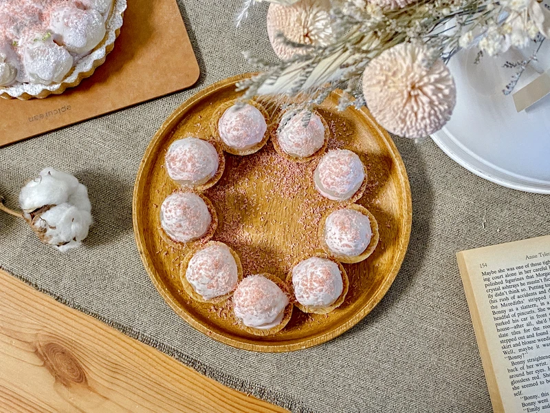 除了迷你塔外,也有提供3.5、6吋、8吋、10吋的可以選擇,也有整顆的蛋糕可以訂購,吃不夠迷你荔枝塔的人可以選擇粉紅荔枝起司塔!放上約20顆的去籽玉荷包,入口感受細緻多汁的果肉與酸甜滋味,就是最療癒的下午茶!