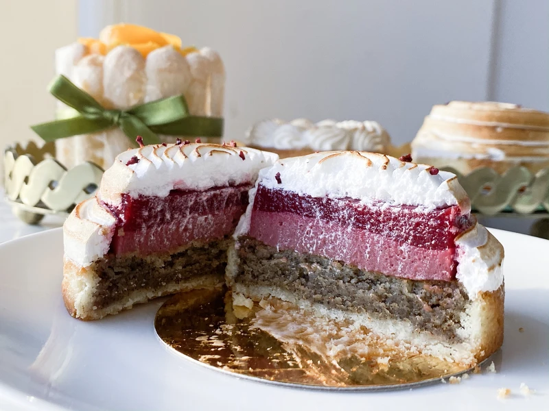 使用兩種不同酸度的覆盆子奶油與庫利,與義式蛋白霜的焦香甜味作平衡,最後殘留嘴裡的則是紅茶的甘甜茶香。