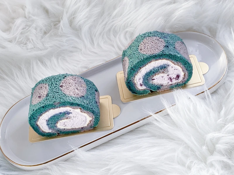 藍莓乳酪蛋糕口味,而藍色使用蝶豆花粉染色,紫色點點則用紫梔子花粉,使用天然色素。內餡是自熬藍莓果醬、奶油乳酪與北海道四葉鮮奶油。
