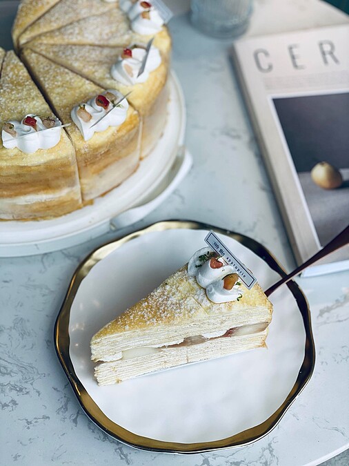 一整個「白水蜜桃千層蛋糕」預計會用到6至8顆的新鮮水蜜桃入餡,加上手工熬煮的水蜜桃果醬,用料相當實在,最上方還有水蜜桃顆粒點綴,粉嫩外觀充滿少女戀愛的氛圍,配上獨家特製的奶油一起入口,軟嫩多汁的果肉在口中綻放,完全不膩口。