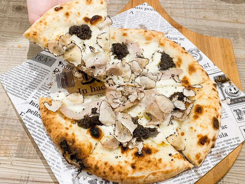 採以口感Q彈的松阪豬豬肉搭配披薩起司與莫札瑞拉起司,現刨多達約20片左右的黑松露,再搭配大量黑松露醬,而黑松露片隨著溫度融入披薩之中,濃郁的黑松露香引領松阪豬的美味口感,看似樸實外觀,風味令人感到回味無窮。