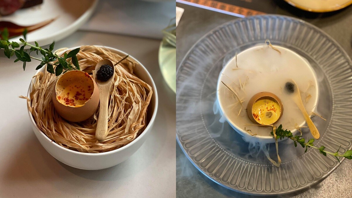 其中光是外型就讓人驚豔的「魚籽雲丹鳥巢海膽蛋」,將有機生食雞蛋以62度低溫後,注入海膽做的「氮氣醬」,鳥巢擺盤配上煙霧花香,將美味氣氛也浪漫帶起。