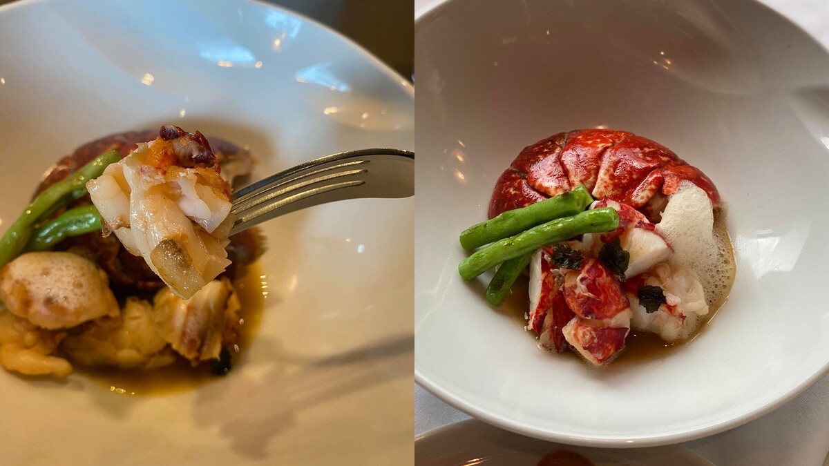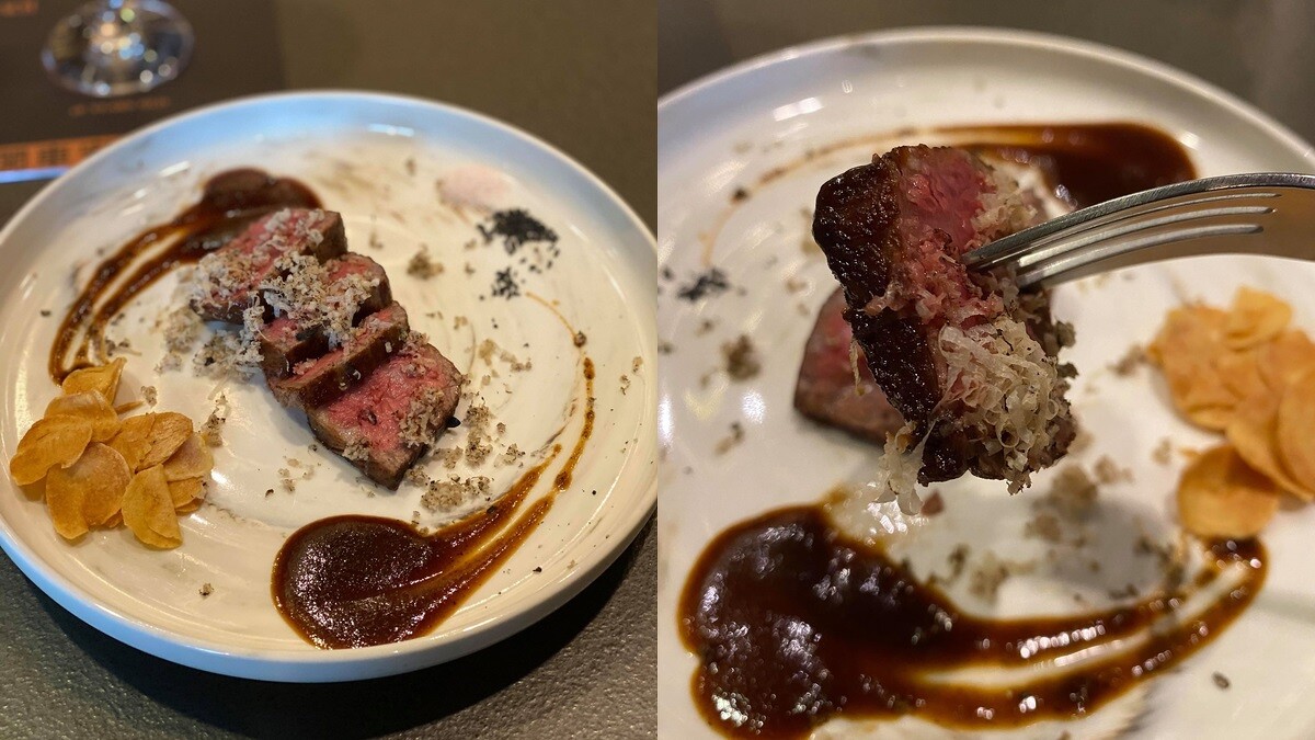 「布列塔尼藍龍蝦 佐蝦膏白蘭地」則是在鐵板上以高溫香煎鎖住水份,搭配以蝦頭和白蘭地細細熬煮的綿密泡沫,鮮甜的龍蝦肉在嘴中綻放,以及主菜「焰燒極上A5和牛厚切牛排5公分 佐現刨松露絲」,5cm厚度的A5和牛焦香酥脆,吃起來軟嫩多汁又不膩口,是最幸福的味覺享受。