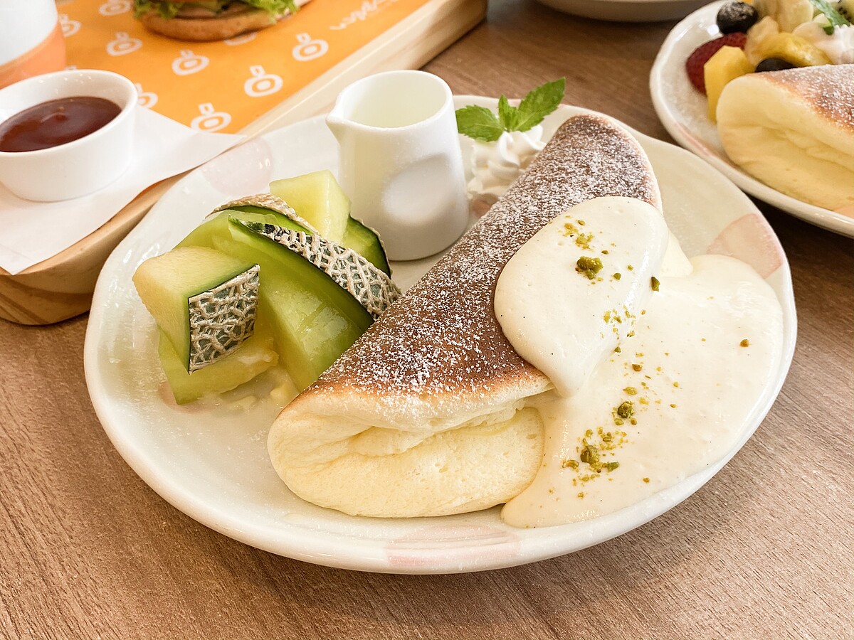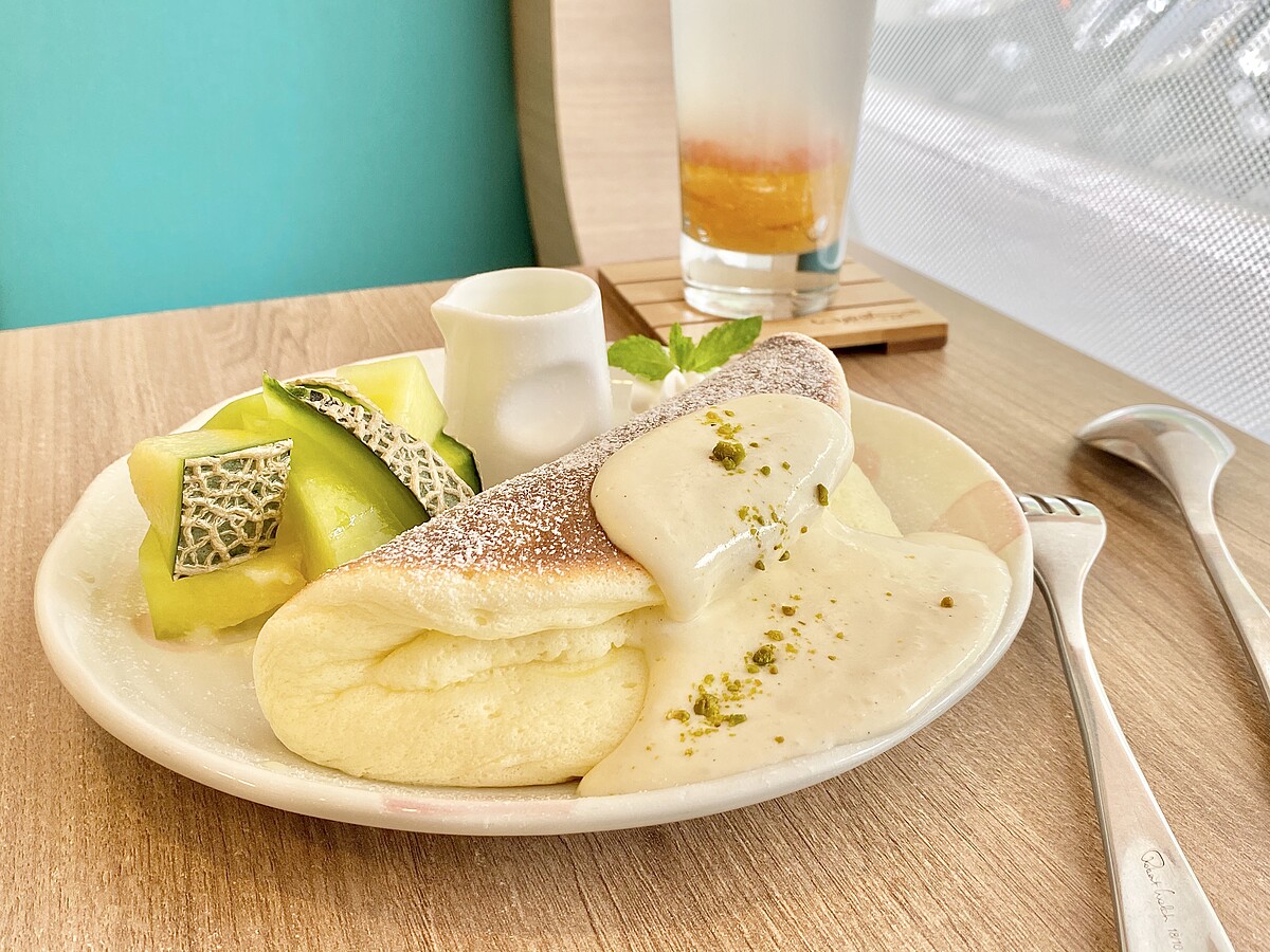 網紋有著交錯密集立體的優雅紋路,富含淡淡麝香味,一切開就有清新的瓜果香氣撲面而來,皮薄多汁飽滿,果肉柔軟綿密、清甜爽口,搭配超Q彈得舒芙蕾鬆餅,想被療癒不能錯過!