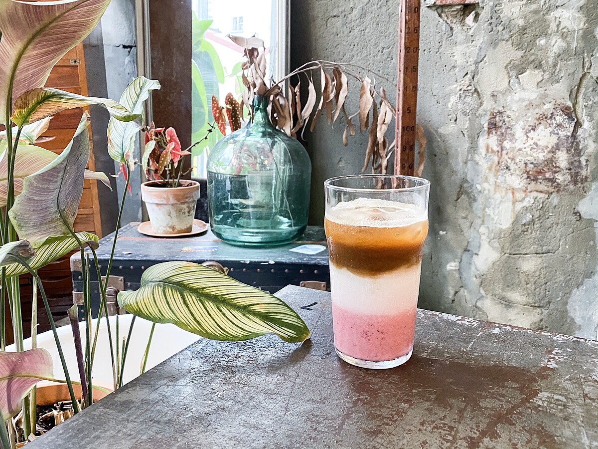 咖啡搭配牛奶、草莓漸層的色彩超級美,喝起來柔順的咖啡香氣搭配草莓酸甜風味恰到好處!